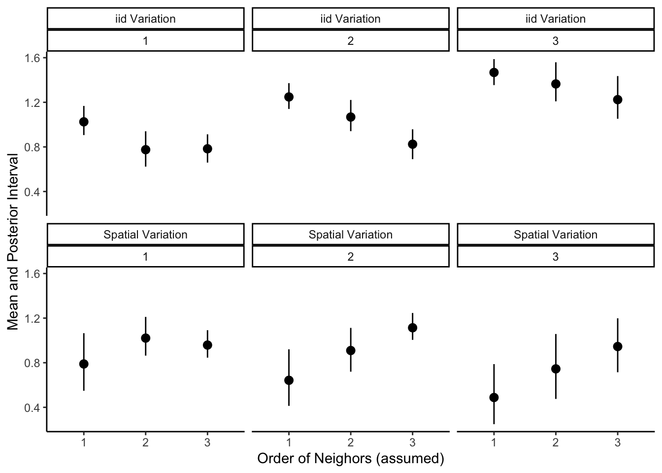 fitf <-function(neigh, df) {# INLA FORMULAform <- yy ~1+ V1 + V2 + V3 +f(areaid, model ="bym", graph = neigh, values =row.names(neigh), scale.model =TRUE) m <-inla(formula = form,family="poisson", offset =log(offset_pop),data=df,control.family=list(link='log'),control.predictor=list(link=1, compute=TRUE),control.compute=list(dic=TRUE, cpo=TRUE, waic=TRUE))mout <-as.data.frame(brinla::bri.hyperpar.summary(m))mout$empircal_sdsp <-sd(df$sp)mout$empircal_sdun <-sd(df$unstruc)mout$waic <- m$waic$waicreturn(mout)}# index book keeping to avoid nested looptr <-expand.grid(1:3, 1:3)modlist <-list()for (i in1:length(tr$Var1) ) {modlist[[i]] <-fitf(nlist[[tr$Var1[[i]]]], dflist[[tr$Var2[[i]]]])}names(tr) <-c("neigh", "df")hyper_results <-do.call(rbind.data.frame, modlist)# label componenetshyper_results$com <-rep(c("iid Variation","Spatial Variation"))# combine results hyper_results <-rbind(cbind(hyper_results[hyper_results$com =="iid Variation",], tr), cbind(hyper_results[hyper_results$com =="Spatial Variation",], tr))hyper_results$neigh <-as.factor(hyper_results$neigh )# plot hyper-parameters over adjacnecy specificationsggplot(hyper_results, aes(y = mean, x = neigh, ymin = q0.025, ymax = q0.975)) +geom_pointrange() +labs(y ="Mean and Posterior Interval", x ="Order of Neighors (assumed)") +facet_wrap(. ~ com + df, scales ="fixed") +theme_classic()